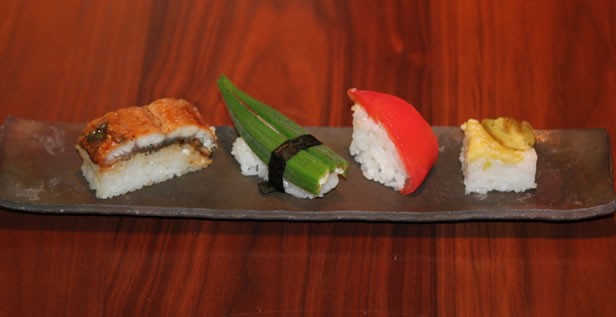 押し寿司は「鰻の山椒煮」以外にも、「オクラの寿司」「トマトの押し寿司」「茄子の押し寿司」と、カラフルな夏野菜の寿司も並びました。