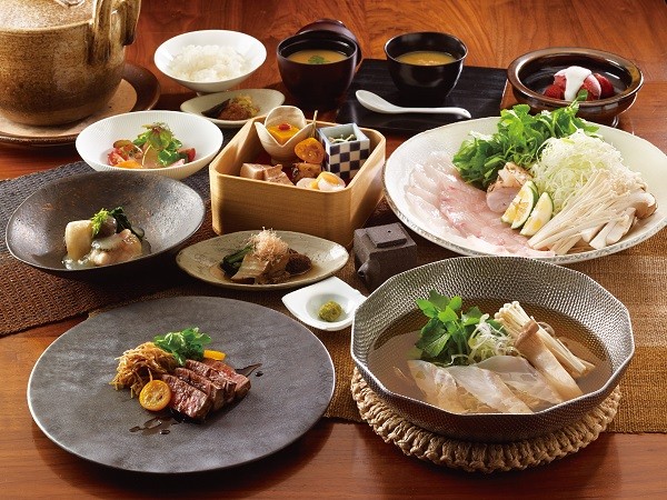 御料理 茅乃舎では、旬の食材や素材の持ち味を引き出したお料理をコース形式でご案内しております。