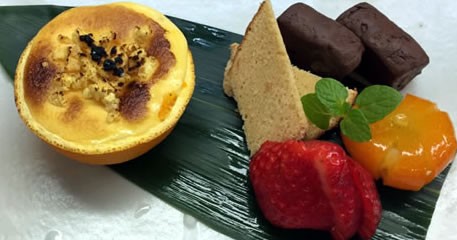 チョコ餅は、タピオカ粉やクルミが入った食感も楽しめました。オレンジは、自家製オレンジピューレ、洋酒、生クリームをオレンジピールの器に詰めてグラタンにしています。