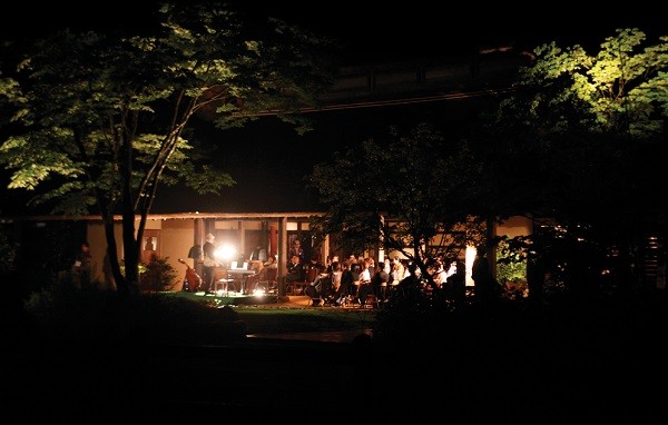 夏の宵に包まれた茅乃舎で、生演奏の音楽と特別料理を味わっていただく人気の「スローなる夕べ」。