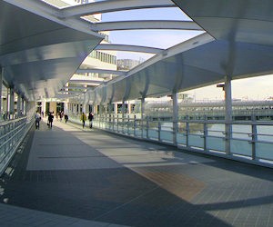横浜駅きた東口Aから横浜ベイクォーターまで徒歩3分、 港の風が吹き抜ける気持ちの良い歩道橋です。天気が良い日は気持ちよくお散歩ができます。