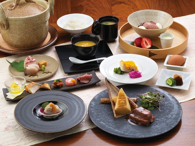 昆布や鰹だし、香味野菜や塩麴、甘麹を加えたふくよかな味わいの“醤油麹ソース”を、糖蜜の甘みとうまみを閉じ込めた香ばしい嘉穂牛に添え、贅沢に絡ませながらお召し上がりいただく「嘉穂牛と筍の炭火焼き」。春の香りを告げる筍の炭火焼きとご一緒にご堪能ください。