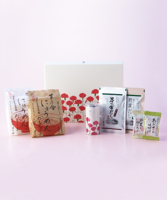 毎年人気のプリザーブドフラワーとだしのセットをはじめ、「減塩茅乃舎だし」の母の日贈答箱もネット限定で取り揃えております。