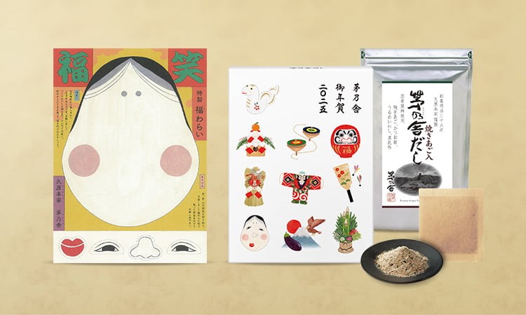 人気の「茅乃舎だし」が、おめでたい干支(巳年)の絵柄が入った、「御年賀贈答箱」として限定発売。みんなで楽しめる福笑いの付録が付いてきます。江戸時代から伝わる正月遊びで、新年から福を呼び込みましょう。