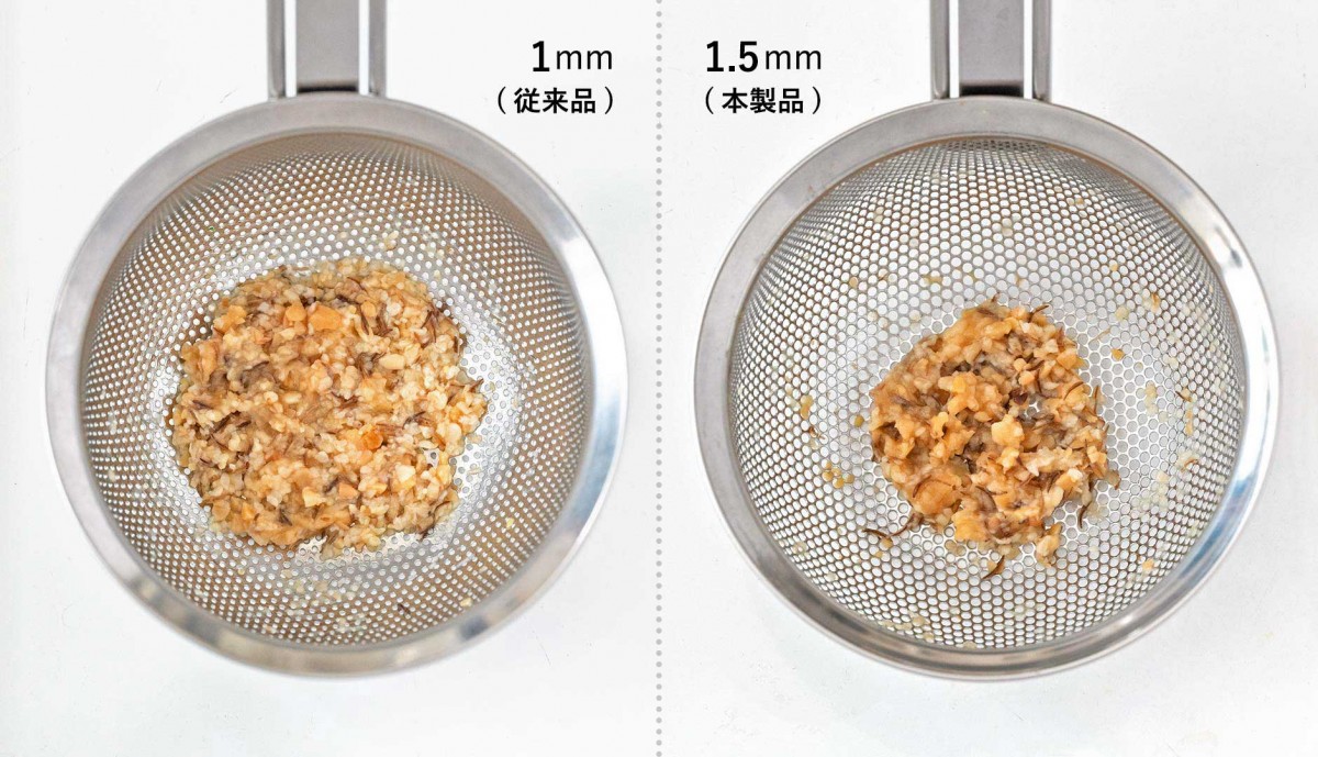 普段何気なくつくっているお味噌汁。味噌漉しを使えば口当たりが滑らかになり、 もっとおいしく感じられます。目詰まりしにくくお手入れしやすいパンチングの穴は 茅乃舎の味噌をはじめ、粒感のある麦みそにちょうどいい大きさにこだわりました。味噌の溶け具合にこだわった漉し網と穴あきスプーンのセットで、調理もスムーズです。