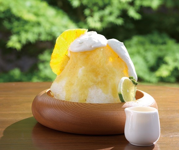 甘みと酸味が絶妙な沖縄県産完熟ピーチパインのみを厳選し、上品な甘みの自家製“パイナップルシロップ”を香り豊かに仕上げました。芳醇でトロピカルな香りの中にも、“レアチーズムース”の隠し味には煮切り味醂を、爽やかな“ライムクリーム”には自社醸造のあま糀をと、茅乃舎らしさが詰め込まれています。糖度が高く濃厚な味わいが特徴の“炙りゴールドバレルパイン”とともに、南国フルーツの代表格でありながら、和テイストをバランスよく調和させた、こだわりのかき氷をどうぞ。