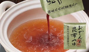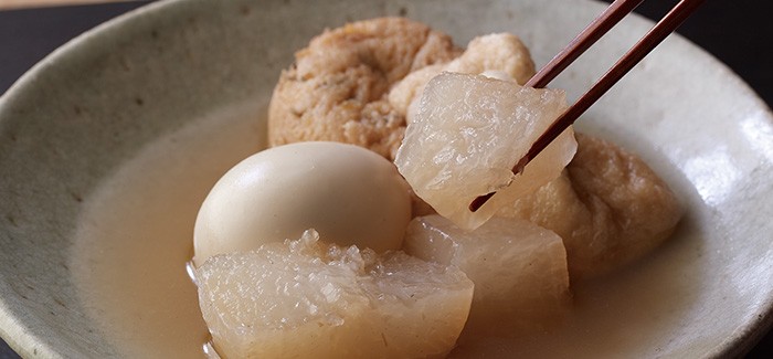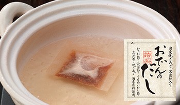 ご家庭でも簡単においしく仕上がる「3段階の調味」のだしとつゆです。具材の芯まで味が染みたおでんは絶品です。