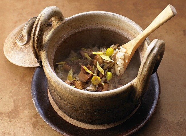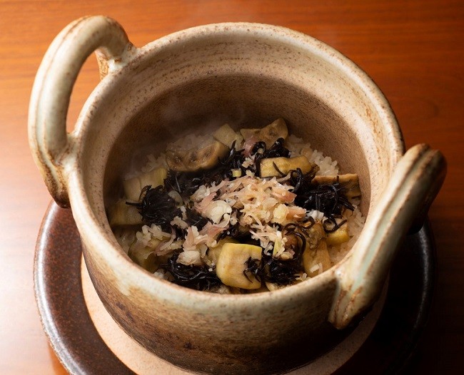 御料理 茅乃舎では、旬の味覚の炊き込みごはん「博多地鶏と銀杏」「茄子」を期間限定にてご用意しております。