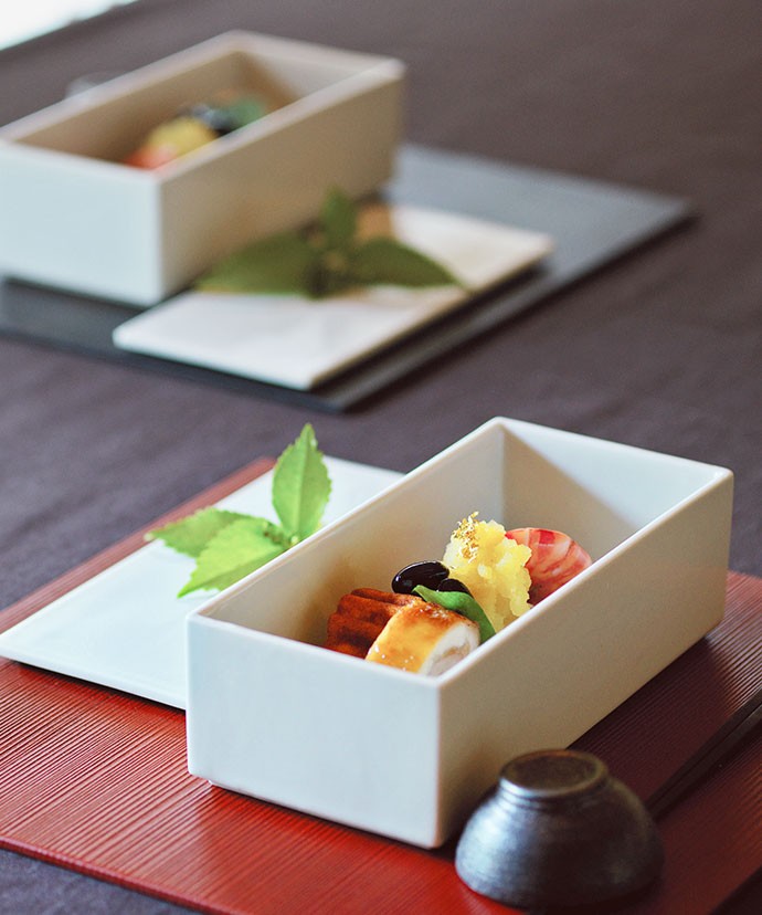 盛付けやすい形で、一人前のおせちのほか複数使ってお重代わりにもなる陶箱です。おつまみやお菓子を盛っても品よく見え、年末年始の食卓に最適。白磁は佐賀・伊万里、鉄黒は佐賀・有田の窯元がそれぞれの得意をいかし、作陶してくださいました。