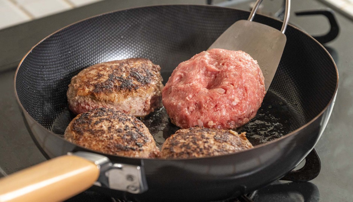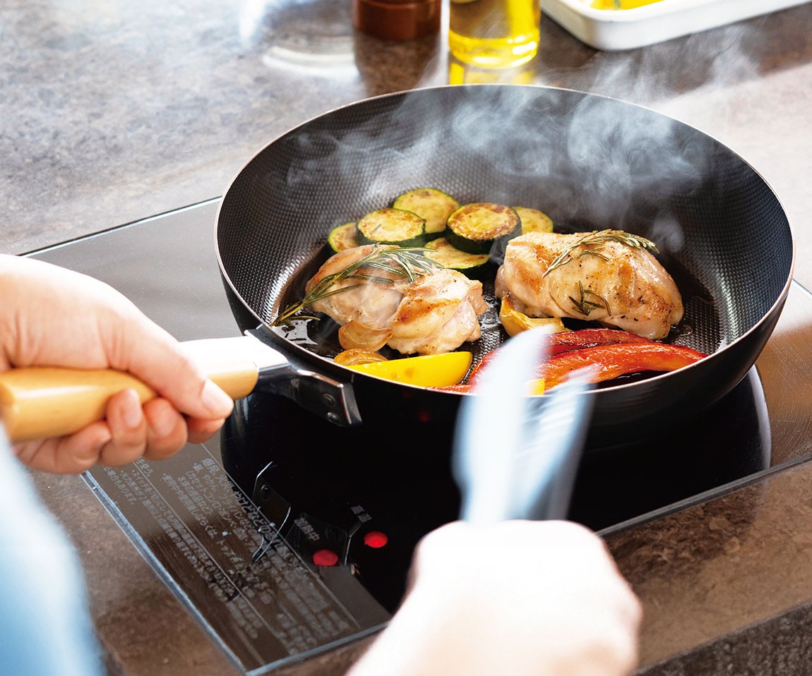 食材の味を逃がさないから、ソテーや炒め物が格段においしくなる鉄のフライパン。深さがあるため揚げ物にも対応します。焦げ付きを防ぐコツは、しっかり温めてから食材を入れ、すぐに動かさないようにすること。だんだんと油がなじみ、より使いやすく育っていきます。