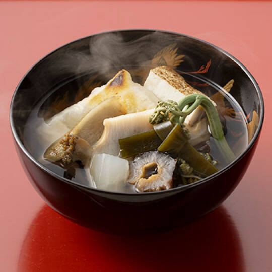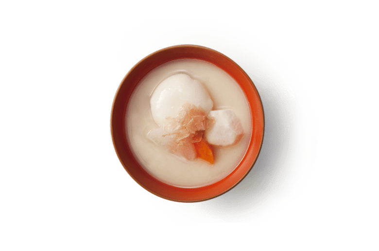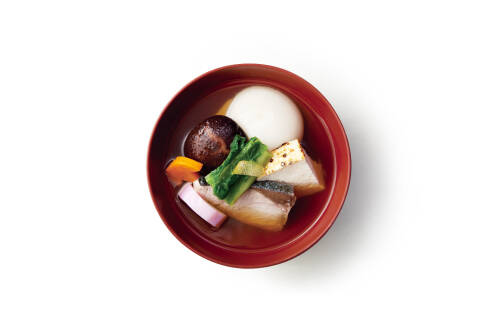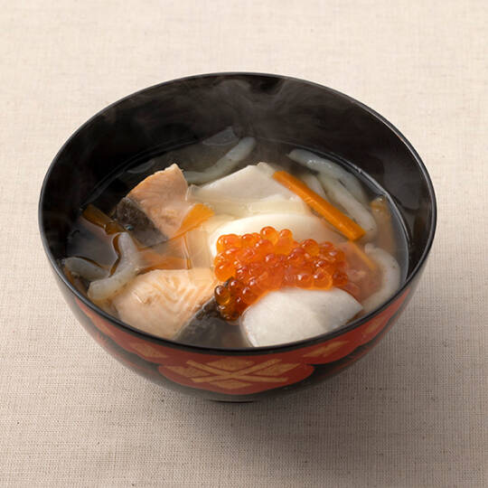 東日本では鮭が、西日本では鰤が正月のお祝いに使われてきました。越後村上では、平安時代から鮭を献上しており、冬になると鮭の塩引きが軒先に下がるのが風物詩となっています。鮭とイクラに加え、大根、人参、里芋といった根菜、こんにゃくやかんぴょうなど具だくさん。根菜類の滋養が溶け合い、体の芯からあたたまる華やかなお雑煮です。