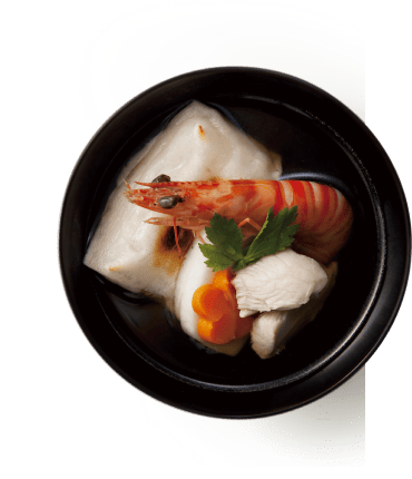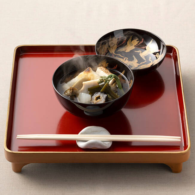 当時のお雑煮は正月だけに食べられるものではなく、上流の武家や公家が大事な客人をもてなす饗宴の料理のひとつでした。本膳料理という形式にのっとり、「式三献」という三三九度の酒に添える肴のひとつとして、お雑煮はふるまわれていたのです。これは今でも、正月にお屠蘇とお雑煮を一緒にいただくことに通じています。お雑煮は、互いに幸をもたらし、結束を固めるための大切な料理として、婚姻の儀式にも出されていました。