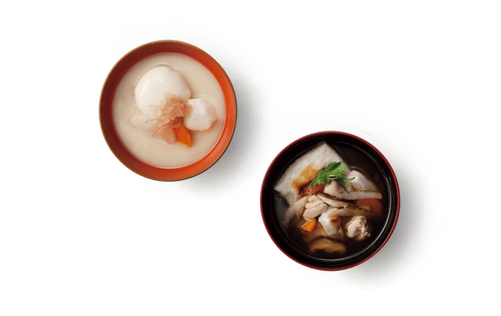 大きく分けて、すましと味噌(主に白味噌)と2つの味付けがあります。もっとも古いお雑煮は「垂れ味噌」で食していたという記録があり、後世で醤油を使ったすまし汁が加わります。だしは、鰹節や昆布、煮干しが全国的に使われていますが、地域によって焼きハゼ、貝柱、鯖節、アゴ(トビウオ)、干し海老など多彩です。