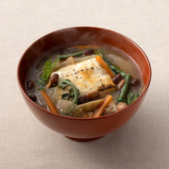 「山のお雑煮」とも呼べそうな青森の「饌(け)の汁」。ゴボウ、人参、大根、こんにゃく、油揚げに、ワラビなどの山菜や、香ばしく煎って煮た大豆、やわらかく煮たささげ豆などが入る独特な汁です。約400年前からあったという説もあり、歴史と神秘性を感じられます。小正月に作りおきして、何度もあたため直して食べることも。赤味噌仕立てで、心安らぐようなおいしさがあります。