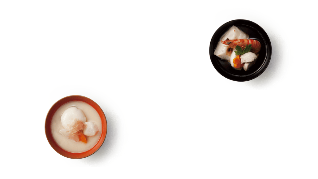 お雑煮の主役である餅。「角餅」か「丸餅」かは、地域によって分かれています。東日本では角餅が多く、西日本は丸餅が多く使われます。古くは丸餅が主体でしたが、江戸時代に平たく伸ばして切り分ける「のし餅(角餅)」が生まれたようです。また一部には、餅を一切入れない「餅なし」のお雑煮があるのも興味深い点です。